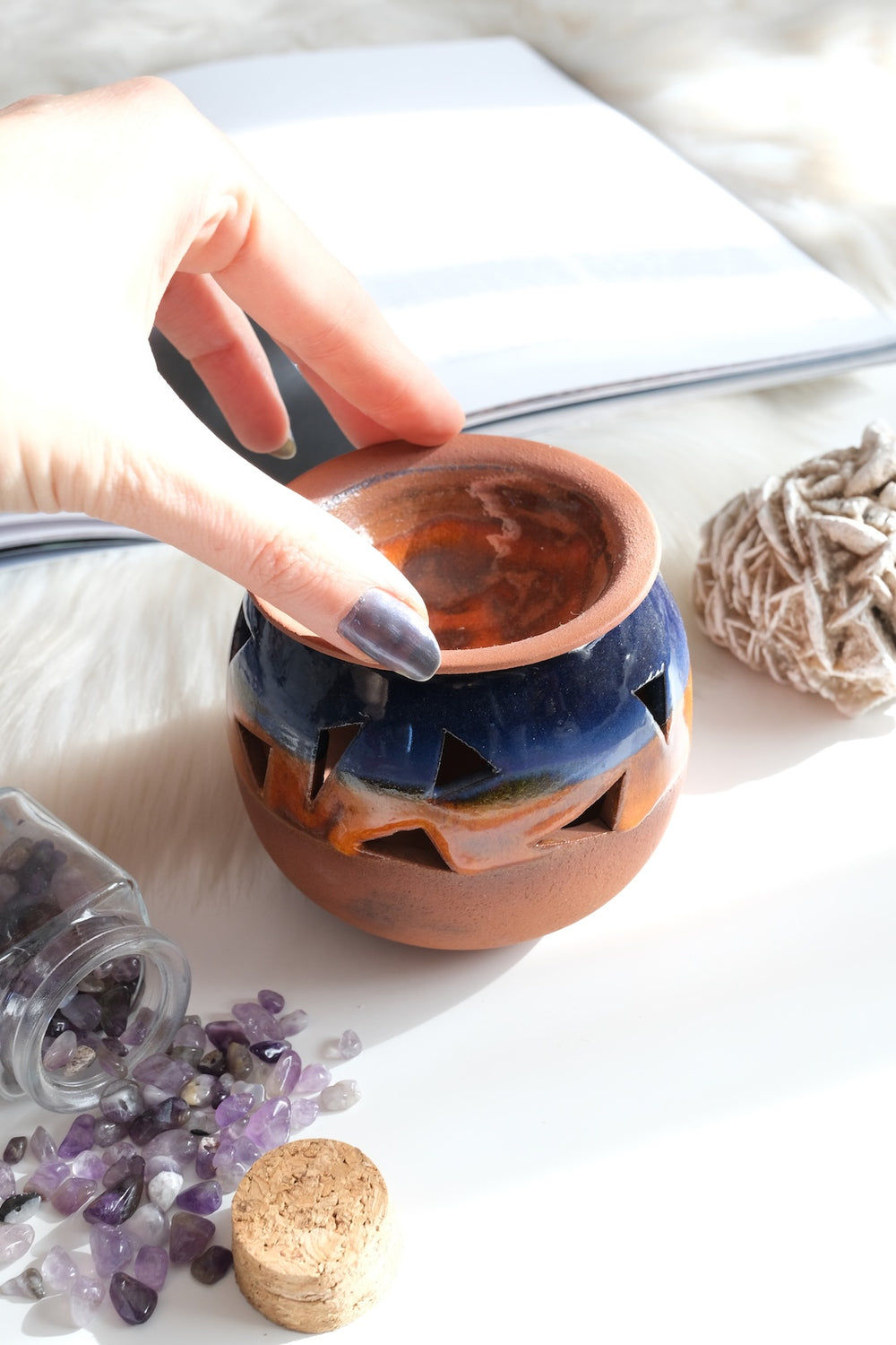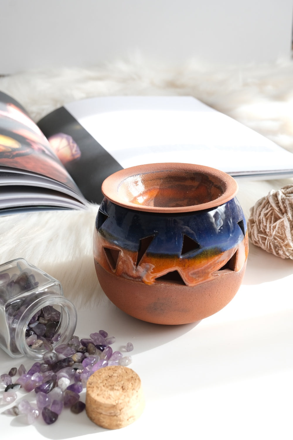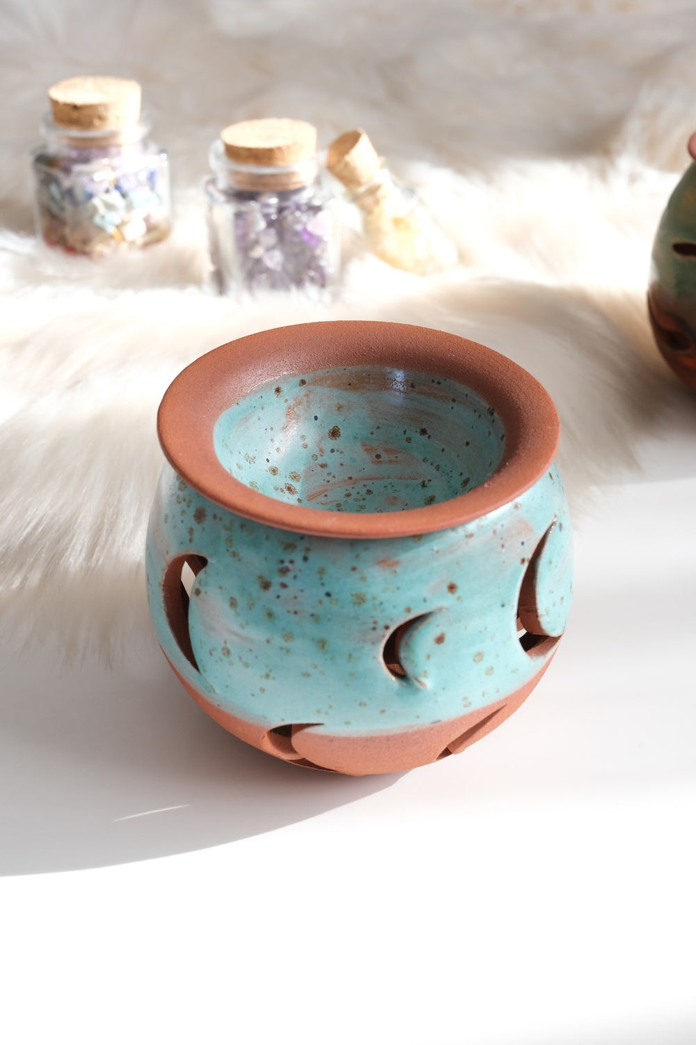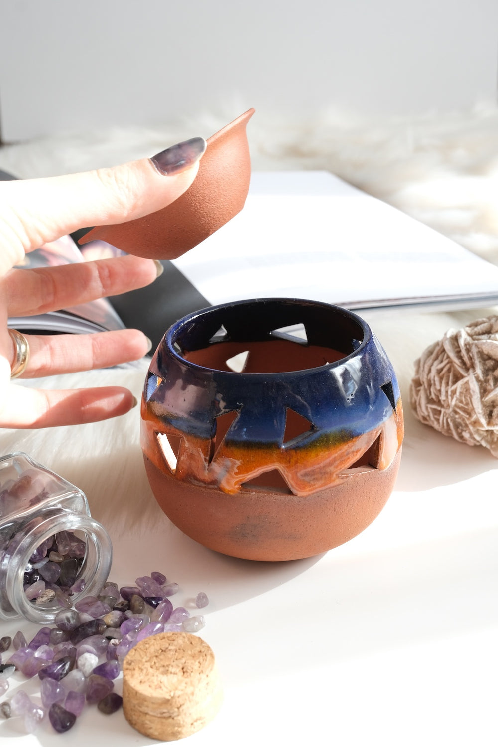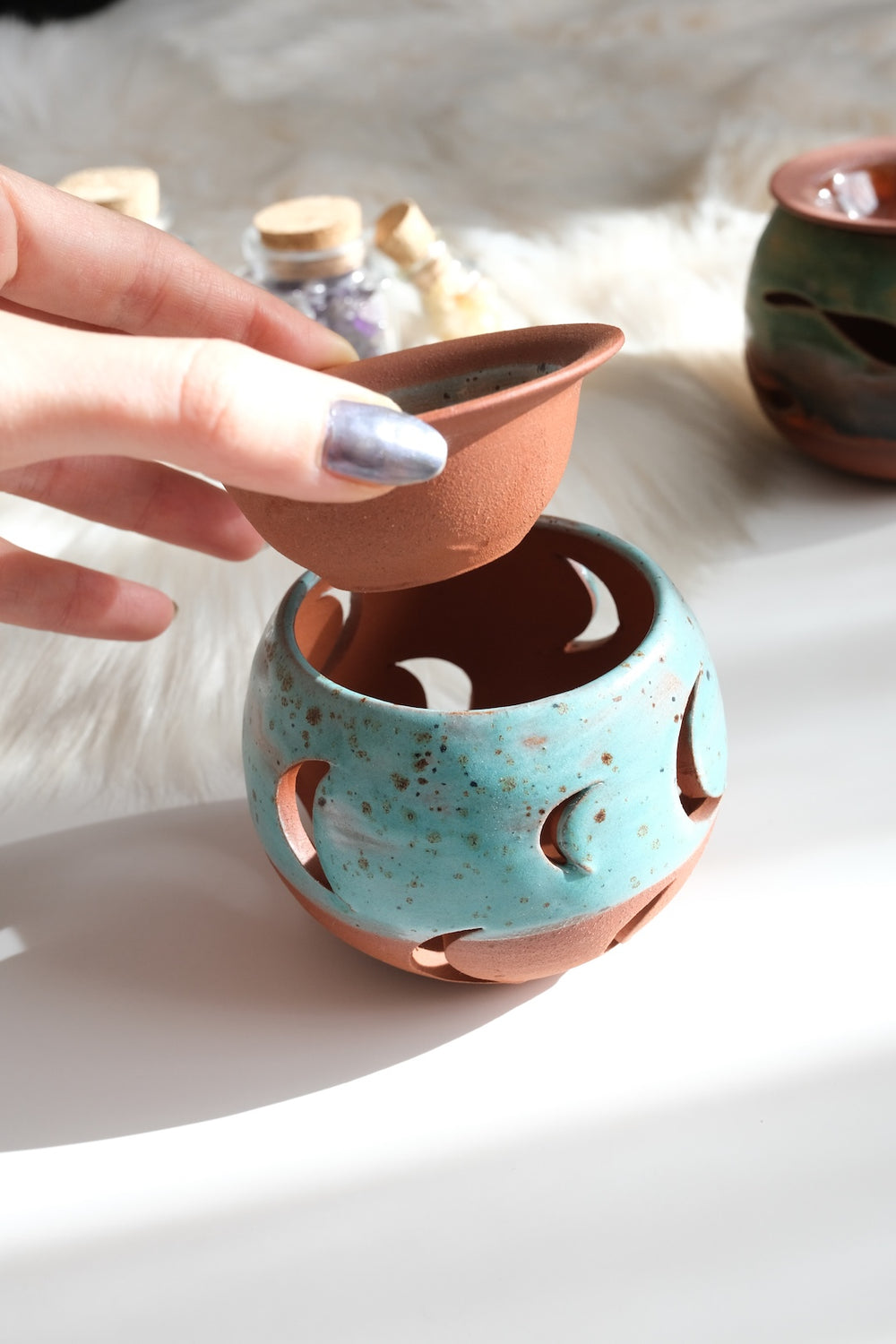 Bu buhurdanlık, yüksek kaliteli seramik malzemeden tamamen el yapımı olarak üretilmiştir. İki parçalı tasarımı, kullanım kolaylığı sağlar: Üst kısmında su ve uçucu yağ için geniş bir hazne, alt kısmında ise tealight mum için korunaklı bir yuva bulunur. Doğal dokusu ve minimalist formu, her türlü dekorasyon stiline zahmetsizce uyum sağlar.