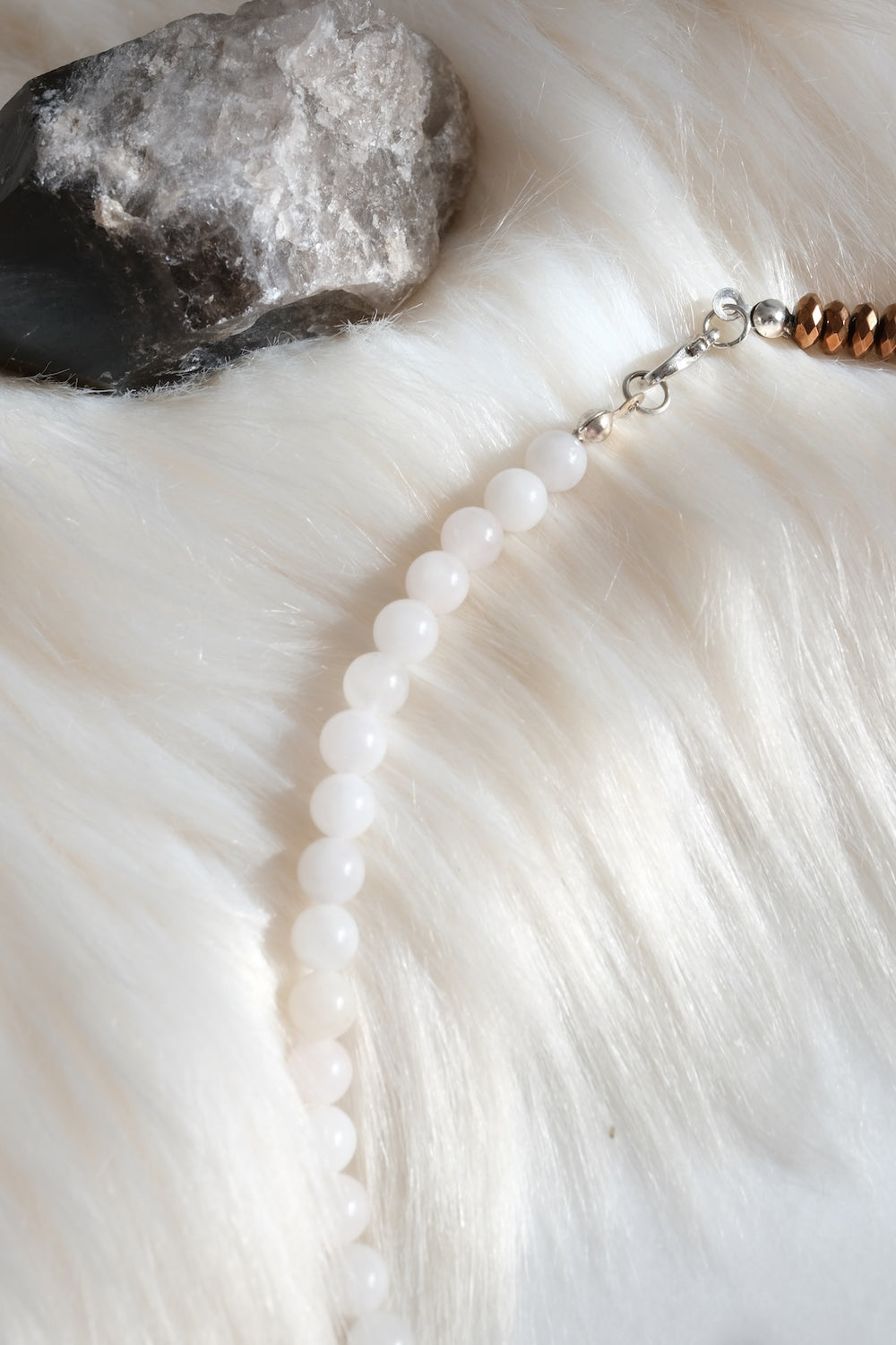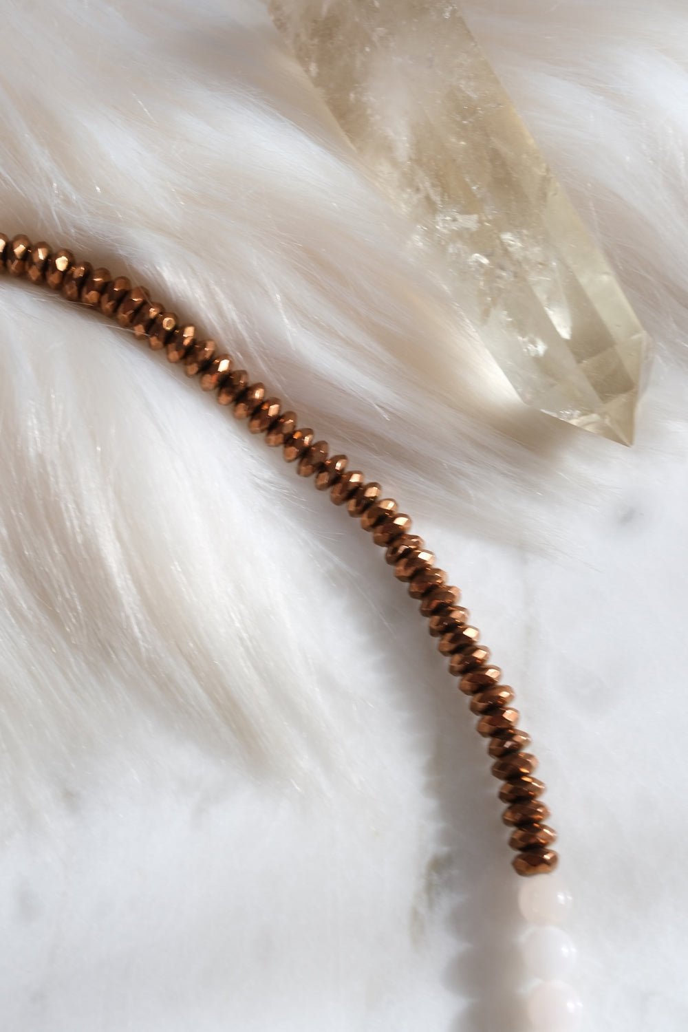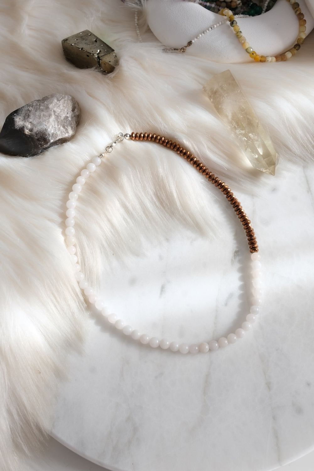 Kolyemiz, özenle seçilmiş yüksek kaliteli, doğal Kristal Kuvars ve Hematit taşlarından oluşmaktadır. Her bir taşın kendine has dokusu, kolyeyi tamamen size özel kılar. Dayanıklı ve ayarlanabilir zinciri sayesinde her kıyafetle rahatça kullanılabilir. Hem Kristal Kuvars'ın ışıltısı hem de Hematit'in metalik parlaklığı, kolyeye modern ve zarif bir görünüm kazandırır.
