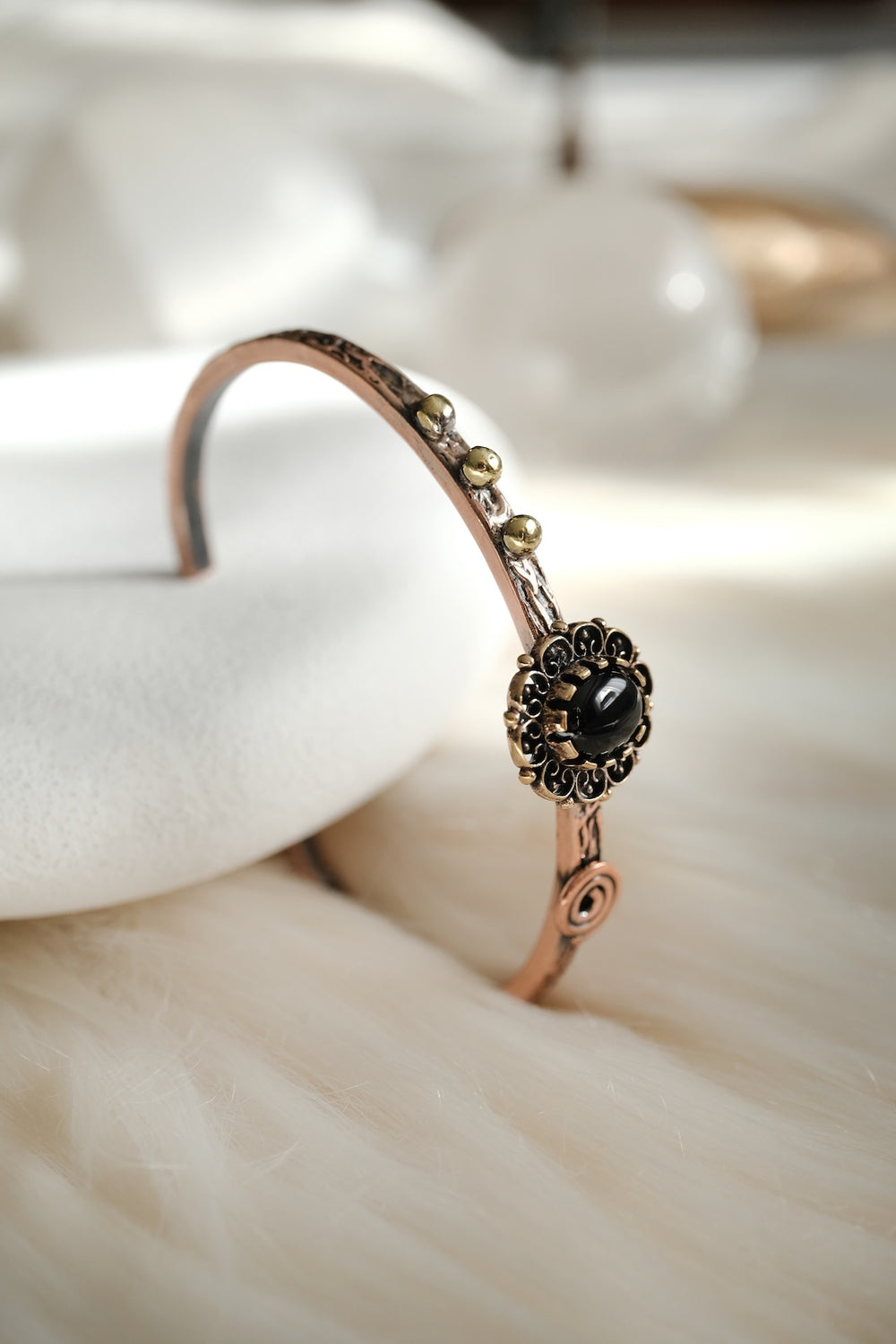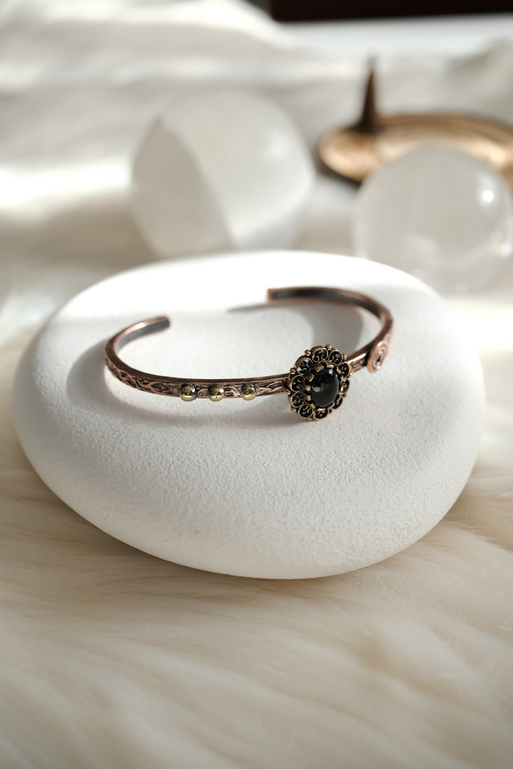 Bu bileklik, parlak ve pürüzsüz yüzeyli oniks taşları ile saf bakır elementlerinin birleşiminden oluşur. Ayarlanabilir yapısı sayesinde her bilek ölçüsüne kolayca uyum sağlar, konforlu bir kullanım sunar. Bakırın zamanla kazanacağı doğal patina, bilekliğe kişisel bir karakter katarken oniks taşları şıklığını daima korur.