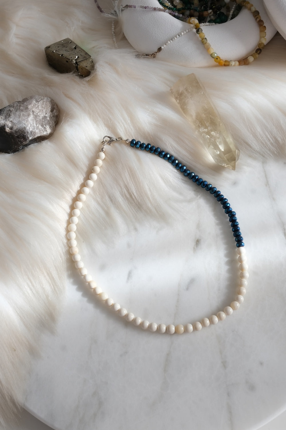 Bu özel tasarım kolye, yüksek kaliteli, doğal sedef ve hematit taşlarından el işçiliği ile üretilmiştir. Taşların özgün dokusu, her bir kolyeyi benzersiz kılar. Kolye, dayanıklı ve hipoalerjenik bir zincir ile tamamlanmıştır, bu sayede günlük kullanım için idealdir. Ayarlanabilir klipsi sayesinde farklı boylarda kullanıma uygundur.